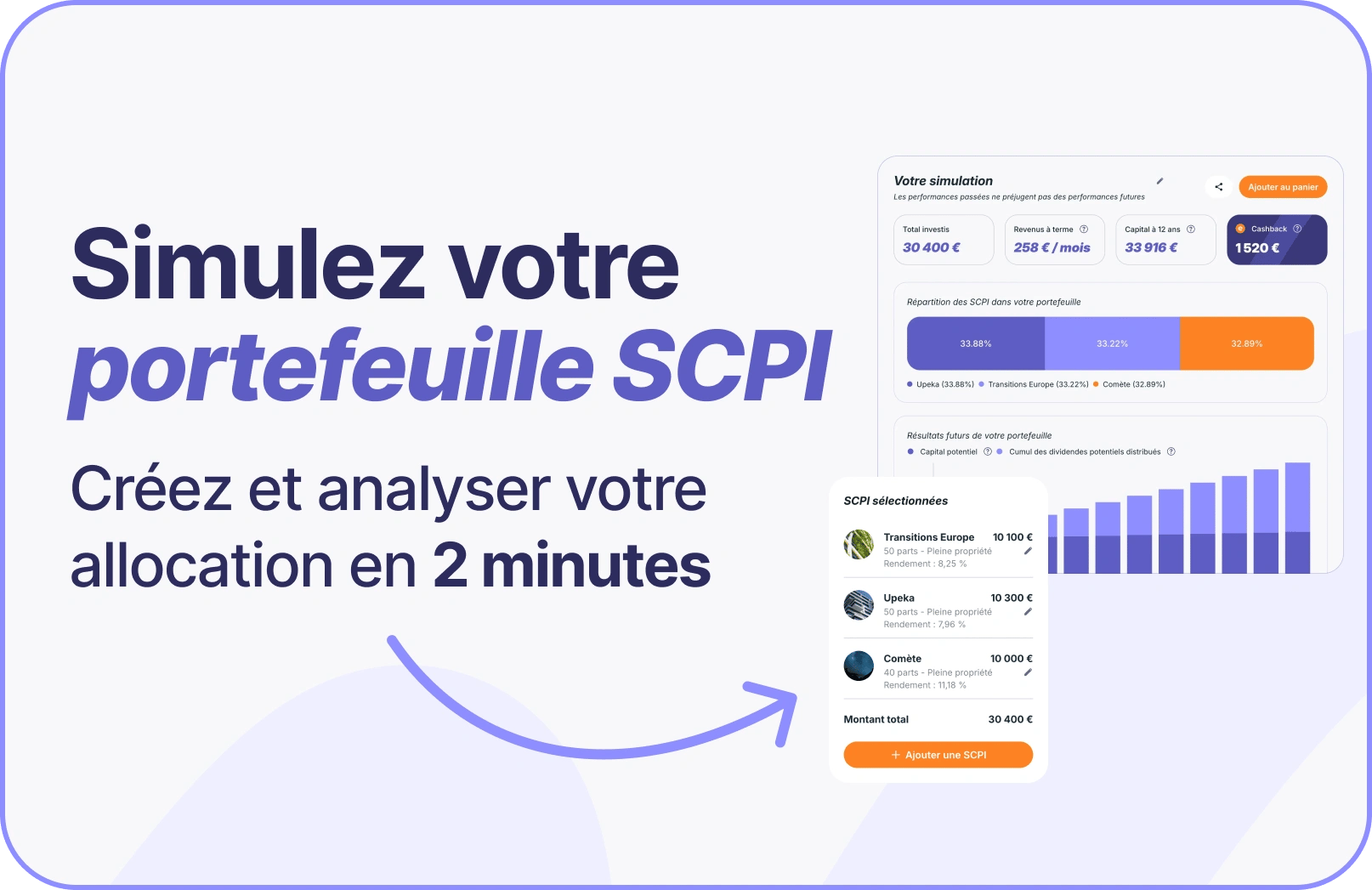 Simulez le potentiel de votre projet en ajustant votre investissement initiale et mensuel. Découvrez instantanément vos revenus potentiels futurs selon la solution choisie (SCPI, assurance vie, PER, ...).